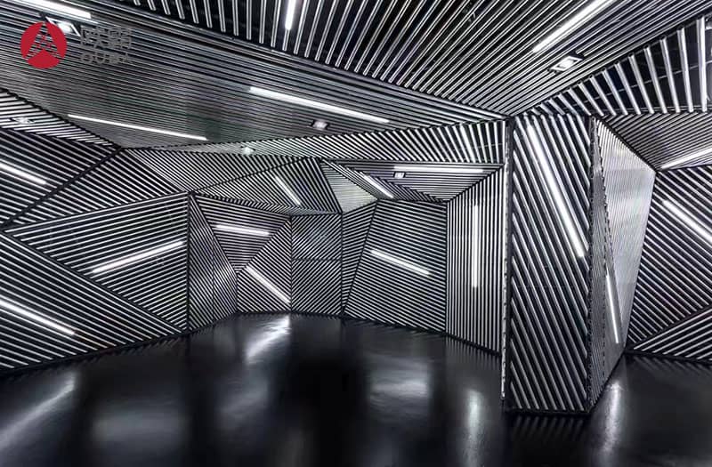 4、鋁圓通工程鋁天花外表柔美,線條流暢,通風,透氣,選用適當高度,以適當視覺角度,圓通鋁天花能產生幕布效果,可將燈具、空調系統(tǒng)、消防設備置于鋁圓通內,以達到整體一致的完美視覺效果;