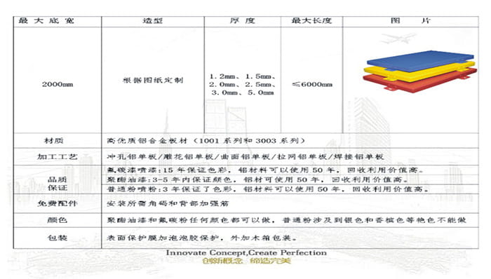 產(chǎn)品規(guī)格: 各類型鋁單板成品通過折彎、滾弧、焊接、A裝、打磨、噴涂等加工手段制作。產(chǎn)品厚度: 厚度有1.2mm、1.5mm、2.0mm、2.5mm、3.0mm、4.0mm等各種規(guī)格,成型鋁單板最大尺寸可達1500x7000mm。