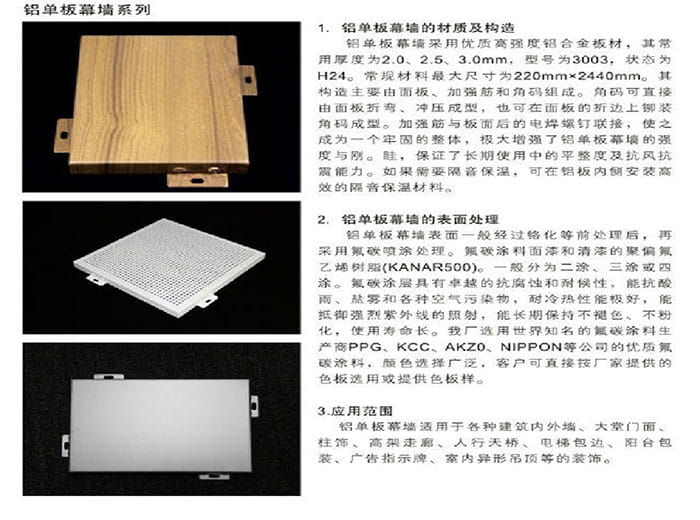產(chǎn)品加工設(shè)備數(shù)控智能化,豐富了鋁單板的表面穿孔樣式,可以為不同建筑類型及裝飾設(shè)計需求定制各種各樣的穿孔鋁單板產(chǎn)品,讓更多的創(chuàng)意設(shè)計得到實現(xiàn)。這種仿木紋穿孔鋁單板可以板面穿孔的基礎(chǔ)上用不同規(guī)格的孔徑和排列表現(xiàn)出豐富的圖案,讓普通的金屬鋁板變得生動,也讓室內(nèi)增加了藝術(shù)元素。木紋鋁單板圖案豐富,效果逼真,紋理清晰。木紋鋁單板防火性、防腐性、防潮性、硬度和強度都是實木無法相比的。木紋鋁單板使用壽命長,能保持10-15年不變色,不變形。仿木紋鋁單板,可應(yīng)用于室內(nèi)吊頂與墻面裝飾。氟碳鋁單板憑其優(yōu)越的耐候性、耐腐蝕性、質(zhì)輕美觀、安裝方便等優(yōu)點被廣泛使用,現(xiàn)已成為大型建筑室外裝飾的新型環(huán)保材料。氟碳鋁單板優(yōu)越的環(huán)保性和可塑性是其它建筑材料不可替代的,因此深受建筑設(shè)計師的追捧。