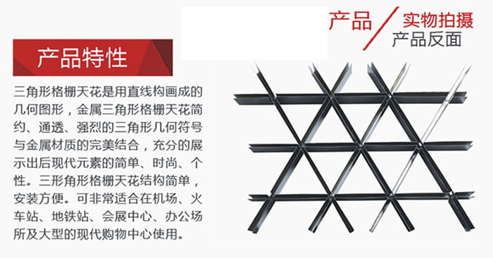 鋁格柵價格:木紋鋁格柵:白色鋁格柵 格柵天花板系列是一種開放型裝飾天花,由鋁合金材料的駁骨,主骨,副骨組成,該系列安裝便利,節(jié)省時間。安裝時先將駁骨縱橫交錯搭成平行網(wǎng)狀骨架,再把主副骨砌成一組組獨立單元,最后把骨架固定連接。其產(chǎn)品特性是防火性能高、通風(fēng)效果好、安裝簡單、結(jié)構(gòu)精巧、外表美觀、立體感強、色彩豐富、經(jīng)久耐用,特別適合于管線不可封閉場所使用,而且每個單元可獨個拆卸,方便內(nèi)部管線維修。特別適用于機場、車站、商場、飯店、超市及娛樂場等裝飾工程。