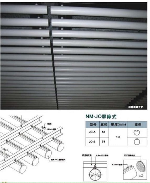 鋁圓通(鋁圓管)天花特點:具有開放的視野、通風、透氣、其線條明快整齊,層次分明,安裝后整個空間和諧柔美的立體線條感,體現(xiàn)了簡約明了的現(xiàn)代風格