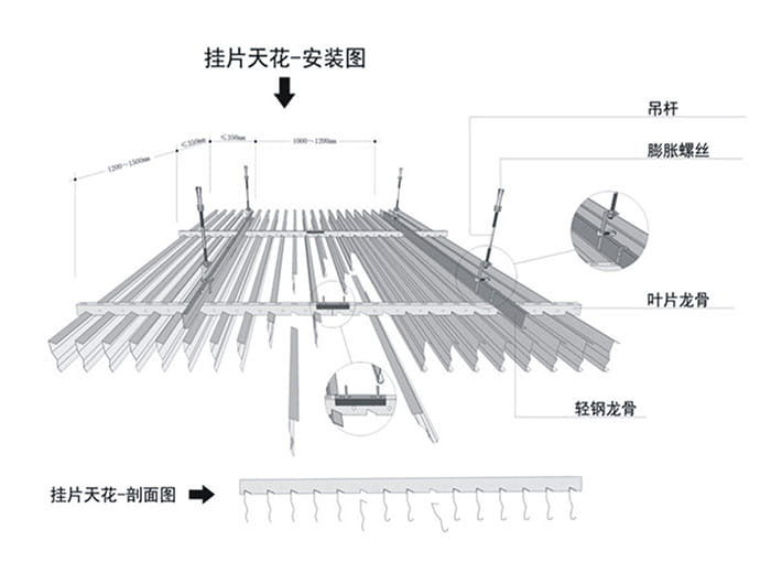 *材質(zhì):掛片為鋁合金,吊件及龍骨為烤漆鋼材