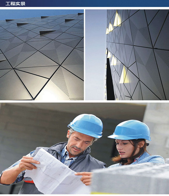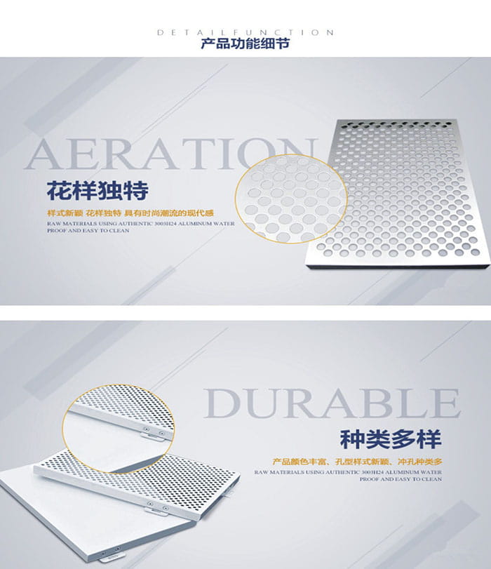 產(chǎn)品加工設(shè)備數(shù)控智能化,豐富了鋁單板的表面穿孔樣式,可以為不同建筑類型及裝飾設(shè)計需求定制各種各樣的穿孔鋁單板產(chǎn)品,讓更多的創(chuàng)意設(shè)計得到實現(xiàn)。這種仿木紋穿孔鋁單板可以板面穿孔的基礎(chǔ)上用不同規(guī)格的孔徑和排列表現(xiàn)出豐富的圖案,讓普通的金屬鋁板變得生動,也讓室內(nèi)增加了藝術(shù)元素。木紋鋁單板圖案豐富,效果逼真,紋理清晰。木紋鋁單板防火性、防腐性、防潮性、硬度和強度都是實木無法相比的。木紋鋁單板使用壽命長,能保持10-15年不變色,不變形。仿木紋鋁單板,可應(yīng)用于室內(nèi)吊頂與墻面裝飾。氟碳鋁單板憑其優(yōu)越的耐候性、耐腐蝕性、質(zhì)輕美觀、安裝方便等優(yōu)點被廣泛使用,現(xiàn)已成為大型建筑室外裝飾的新型環(huán)保材料。氟碳鋁單板優(yōu)越的環(huán)保性和可塑性是其它建筑材料不可替代的,因此深受建筑設(shè)計師的追捧。